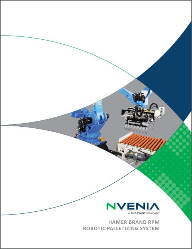 Our Hamer Brand High Speed Robotic Bag Palletizer sets the standard for robotic bag palletizing, delivering consistent performance at rates of 24–27 bags per minute. For applications with pallet stacks in the 60” height range such as Soils, Salt, Chemicals, Packaged concrete and other high bulk density bags, these can now run at speeds approaching traditional conventional palletizer system rates. This is accomplished with a smaller footprint, lower up-front capital costs, and significantly lower annual maintenance costs.